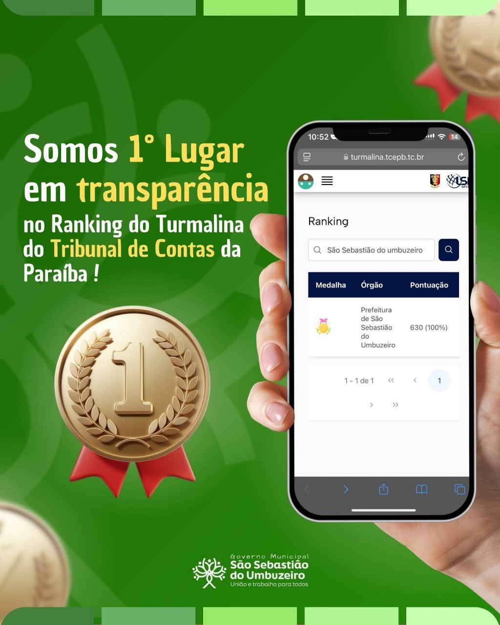 Na avaliação deste sábado dia 12 de abril de 2025, a Prefeitura Municipal de São Sebastião do Umbuzeiro alcançou o 1º lugar no ranking Turmalina de transparência pública, promovido pelo Tribunal de Contas do Estado da Paraíba (TCE-PB), e foi agraciada com o Selo Ouro, a mais alta distinção concedida pelo órgão que avalia o grau de transparência dos portais eletrônicos das prefeituras e câmaras municipais paraibanas.
