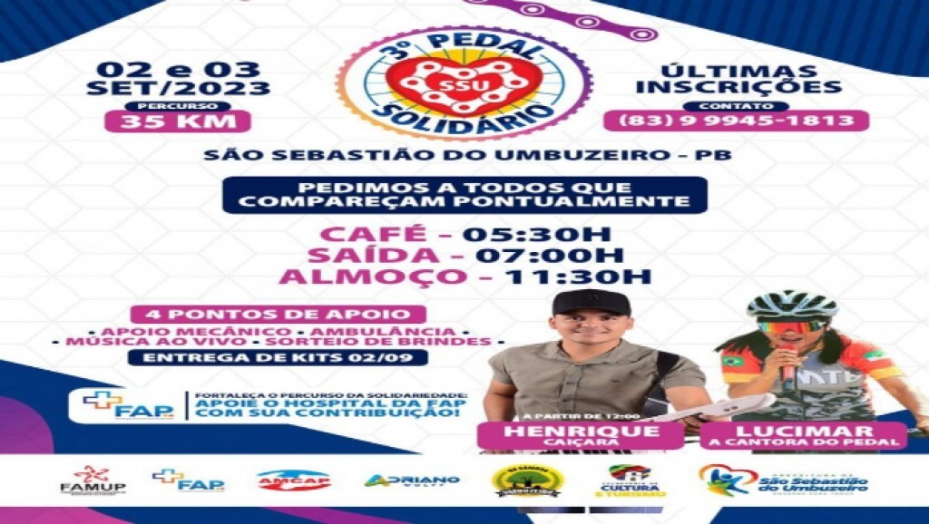 O Pedal Solidário de São Sebastião do Umbuzeiro já é considerado um dos mais organizados e prestigiados de toda a região. Para maiores informações os ciclistas interessados podem entrar em contato com a página do pedal no Instagram: @pedalsolidariossu.
